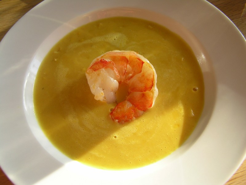 bei uns gabs heute maiscremesuppe mit garnele - und zum nachtisch ein stück apfelstrudel mit vanillesoße