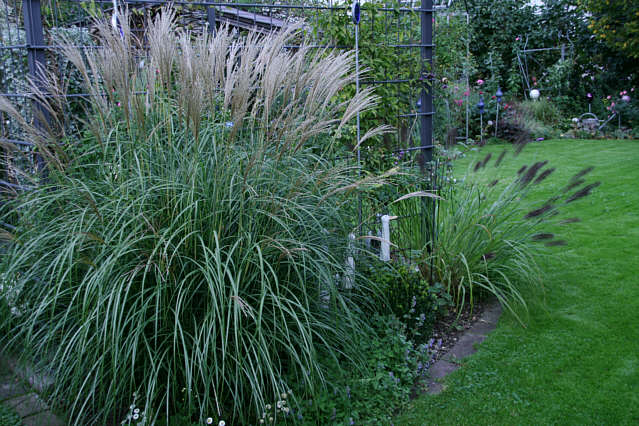 Für die 'Kleine Silberspinne' braucht man jedoch reichlich Platz. Bei mir wird sie so breit wie hoch (inzwischen 125 cm).Einen überhängenden Eindruck macht auch die 'Kleine Fontäne', obwohl die Halme eigentlich sehr straff aufrecht stehen.