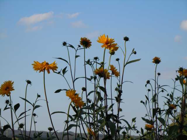 Da kann ich vielleicht auch mal was beitragen:Helianthus atrorubens, dieses Frühjahr ins ehemalige Gemüsebeet gepflanzt, hat sich gigantisch entwickelt.