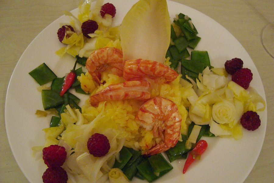 hier gab es garnelen (bio black tiger) auf safranreis (eigene safranernte) mit mit jungem ingwer und chili gewürzten zuckerschoten und chicoreesalat mit zitronensaft-olivenöl und frischem gartenknoblauch...