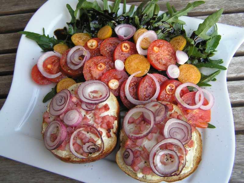 ich hab mal geschaut, was sich noch so im garten findet. rucola, physalis, tomate olirose, orangene chili, rote zwiebel.das ganze als salat mit balsamicocreme, olivenöl, salz und pfeffer.woah, war das eine aromenexplosion