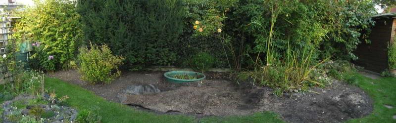 Mein gedachtes Ziel:Moorbeet, Sumpfbeet, feuchtes Staudenbeet Aber: Mir fehlt das ansprechende Konzept!Wie soll ich mit den unverrückbaren Gehölzen verfahren?Wie mit der ziemlich fixen Beettiefe?Wie mit mit der 2-3 m hohen Zaun-Hecke?Ist die Regentonne integrierbar? Oder besser raus?Sollte ich die Teichwanne versetzen? Ich stand heute eine Viertel Stunde vor dem Beet und war ratlos.Habt ihr Ideen?Hier mal ein erster Überblick. Es geht um den gesamten Bereich zwischen Regentonne (links) und Schuppen (rechts) - immerhin 10 Meter!