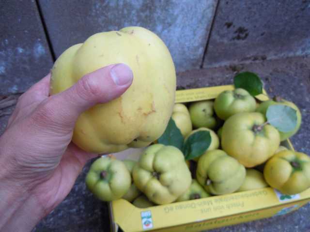 Meine Quitte ist auch reif. Hab sie diesmal grüngelb geerntet, damit sie keine Fleischbräune bekommt. Jetzt schon duftet sie extrem süßaromatisch und das Fleisch ist für eine Quitte sehr zart, fast wie ein fester Apfel.Sorte soll Bereczki sein, isse aber nicht. Somit bin ich ratlos. Aber die Sorte ist gut (Konstantinopeler? Lescovac?).Der Baum wächst halbschattig auf gar nicht gutem Boden, sehr tonig und für meine Verhältnisse eher feuchter. Eigentlich nicht so der ideale Quittenstandort