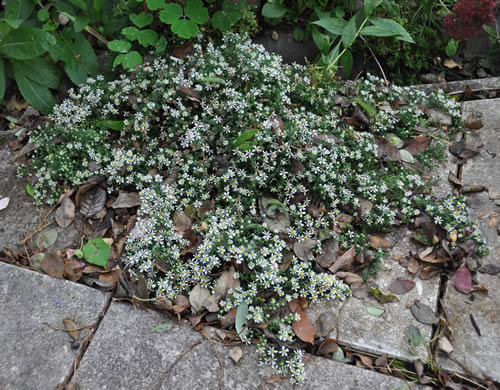 Das ist Aster pansus/ericoides 'Snowflurry'.Vorhin habe ich auch noch im Garten ein blühendes Asterchen entdeckt. Kleine winzige Blütchen und es kriecht.