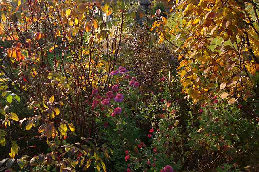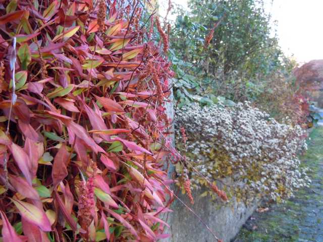 Bistorta affinis "Superbum" und Aster divaricatus legen sich über die schattige Mauer zum Nachbarn rüber.