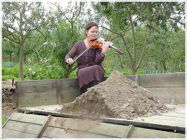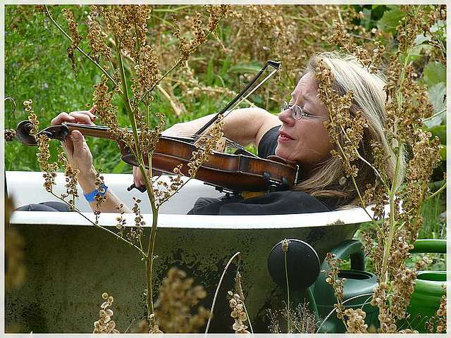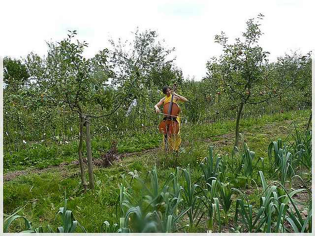 wir wurden zuerst gebeten, den garten von sieben linden zu erkunden.dort hatten sich die musiker verteilt, um an aussergewoehnlichen plaetzen solistisch oder in kleinen gruppen zu musizieren: