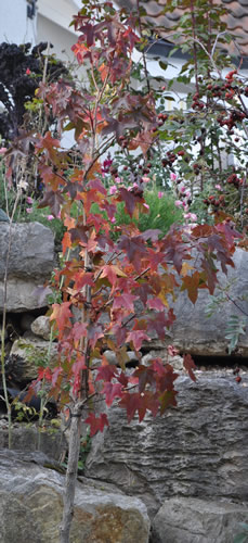 Der noch junge Amberbaum mit schöner Herbstfärbung: