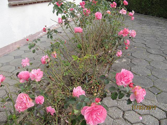 Sie hat auch bei mir noch etliche dicke Knospen.Es blühen noch 'Fornarina' und die unermüdlichen Polyanthas Marie Pavic, Anne Marie de Montravel und Heinrich Karsch. Außerdem 'Leonardo da Vinci' (die ich eigentlich gar nicht mehr mag