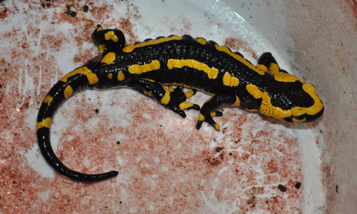 Schönes Foto mit dem schönen Tier drauf!Vor kurzem musste ich einen solchen gleich zweimal retten.Nachts im Garten beim Hundefutterausstreuen mit der Stirnlampe trat ich beinahe auf was drauf. Ein Feuersalamander wuselte durch den Garten. Ich setzte ihn zuerst am Rand des Teiches zwischen Steinen aus, den er überquerte um dann an der steilsten Stelle zu scheitern worauf ich ihn in die Gartenmauer, mit vielen Ritzen brachte. Am nächsten Tag schwamm er in einem grossen Wasserbehälter und kam nicht mehr raus. Wie der überhaupt dorthinein kam, es war der gleiche, sicher 20 m weiter von der Mauer entfernt! Mit Brettchen und Aussteighilfe verschwand er dann, völlig ermattet zwischen den Steinen.Der Feuersalamander war etwa 16 cm lang.