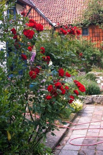 Ich habe im Garten eine blutrote Strauchrose (Kletterrose?), die ca. 2.00-2,20m hoch ist und dieses Jahr besonders üppig blüht.Diese Rose habe ich vor mehr als 20 Jahren bei einer Besichtigung eines Internats am Tag der Offenen Tür als Steckling von den Schülern erstanden, namenlos natürlich. Nach ein paar kümmernden Jahren auf dem Balkon wanderte sie dann in den neu erworbenen Garten, wo sie bis heute lieb und unerkannt blüht, nicht meine Lieblingsrose, aber sie rührt mich.Wer könnte sie sein?