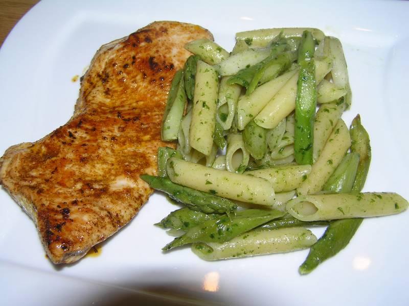 also gabs heute nudeln mit gebratenem grünen und weißen spargel mit bärlauch, dazu ein putenschnitzel + salätle