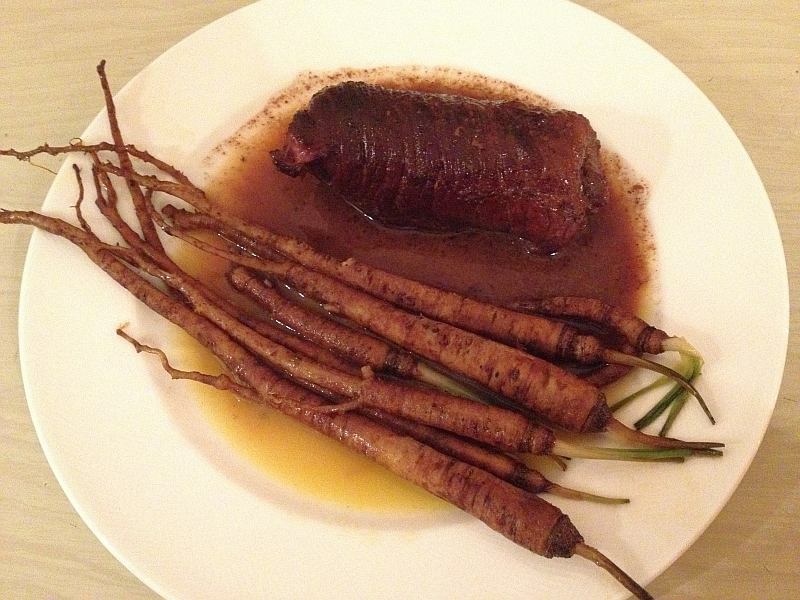 nachtmahl heute :Dpferderoulade mit senf, lardo di colonnata, roter gemüsepaprika, schwarzen oliven, schluppen, frischem rosmarin und sizilianischem fenchel, dazu haferwurzeln in meersalz-safran-sud gegart.[size=0]keine sättigungsbeilage, aber geröstetes weißbrot zum stippen.