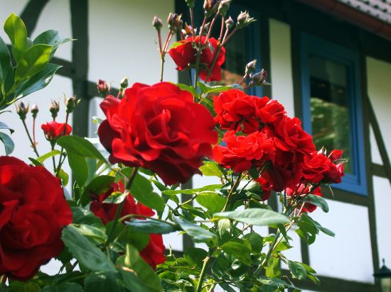 Richtig öfterblühend ist meine rote Strauchrose nicht. Es gibt hin und wieder nochmal vereinzelte Knospen bzw. Blüten. Ich würde sie aber eher unter einmal blühend einstufen.Das Rot ist eine Farbe, die weder zu Orange, noch zu Blau tendiert, also richtig rot.