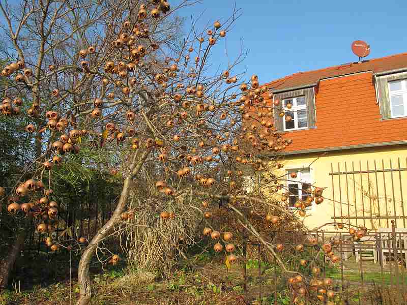 Punica granatum (ca. 4 m hoch) mit lange anhaltender, goldener Herbstfärbung; dieses Jahr hatte ich leider nur 3 Früchte, aber immerhin. (bei uns hier absolut frosthart; keinerlei Schäden in den letzten kalten Wintern)
