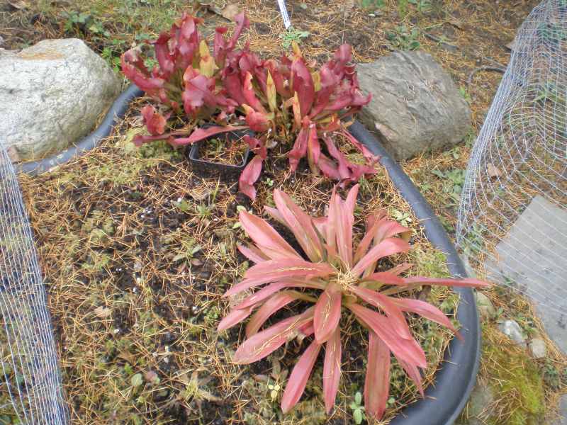 In rot bis rot-braun: Helonias bullata und Sarracenia.