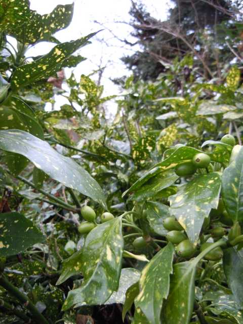 Eigentlich immer gleich gefärbt: Aucuba.Aber erst im Herbst/Winter fallen die gepunkteten Blätter so richtig auf Mein Exemplar ist mittlerweile über 2 m hoch und breit. Die Beeren werden im Laufe des Winters rot