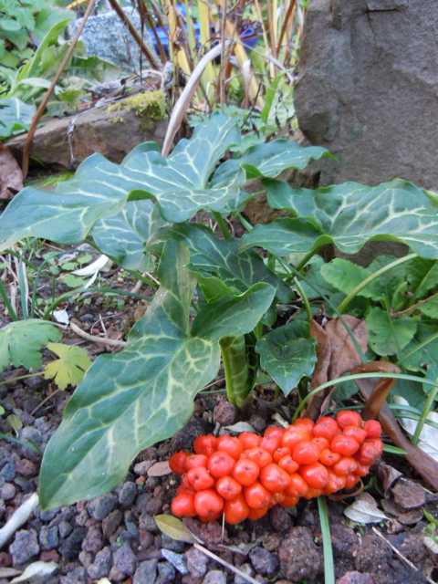 Desgleichen passiert hier auch: da haben Vögel auch die Fruchtstände meines (einzigen!) Arum italicum geplündert, und rund um ihre bevorzugten Sitzbäume im benachbarten Bruchwald gibt es jetzt Aronstab-Nachwuchs mit dem typischen Blattmuster.Hier versamen sich auch die Pictum-Typen with a little help from the birds gelegentlich.Die Dinger stehen teilweise im Wald, an trockenen, sonnigen Stellen, aber dort blühen sie kaum, sind aber unheimlich zäh.
