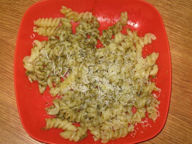 :Spirelli mit Pesto genovese aus dem Glas und geriebenem Parmesan. Beim Pesto hab ich mal wieder nicht auf die Marke geachtet und wurde mit einem Geschmack, der an Heu erinnert, bestraft