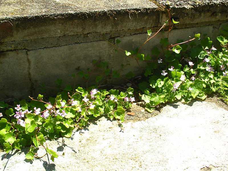 Zimbelkraut und Hornveilchen im Hauseingang, wir stelzen immer ganz vorsichtig drüber