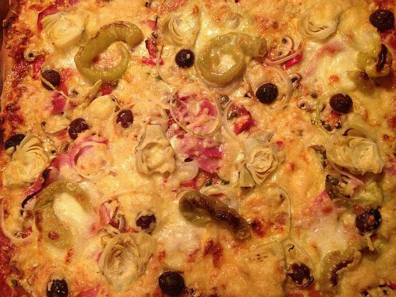 klar kann ich. :)abgesehen vom mit tomatenmark verstärkten gartengekräuterten gartentomatengrund und der auflage aus geriebenem käse war folgendes der belag:rote gemüsepaprika (in stücken)champignons (in scheiben)zwiebel (in ringen)kochschinken (zerfetzt)kapernartischockenherzen (halbiert)schwarze oliven (ganz mit stein)milde peperoni (entstielt)mozarella (in scheiben)also eher unspektakulär - aber lecker!