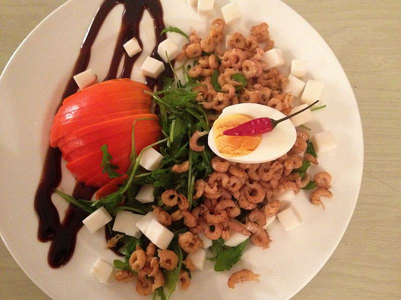 hier gab es rucolasalat mit nordseekrabben, ziegenkäse, kaki und ei