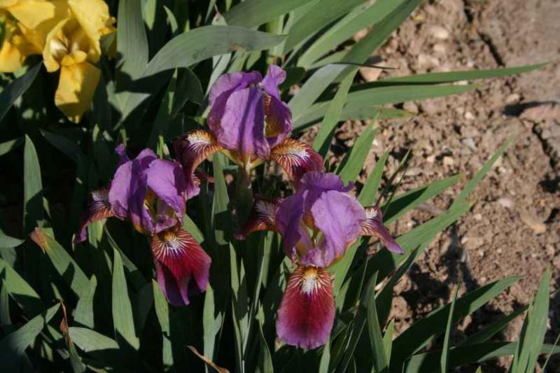 Hier blühen wieder welche. Diese beiden Unbekannten ähneln sich zwar sehr, scheinen aber der Größe nach zu urteilen doch unterschiedliche Züchtungen zu sein. Purpurviolette Iris rd. 40 cm hochPurpurviolette Iris rd. 25 – 30 cm hoch