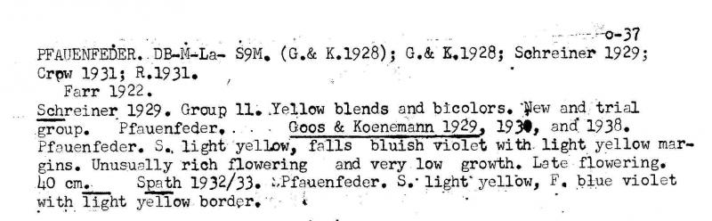 Lieber HenningIch habe mir heute nachträglich den Iris 2011 Thread durchgesehen.So wie es aussieht gibt es keinen anderen Namen für deine Iris.Eine Wildart ist es auch nicht. Ein zufälliger Gartensämling ist unwahrscheinlich, da es offensichtlich eine Hybride zwischen niedrigen und hohen Bartiris ist, die ja nicht zur gleichen Zeit blühen. Bleibt mein Verdacht: „Pfauenfeder“ Hier die Beschreibungen aus den Goos und Koenemann Katalogen:Pfauenfeder (G&K 1928) Neu!Domblätter hellgelb, Hängeblätter violettblau mit hellgelbem Rand, außerordentlich reichblühend und von.ganz niederem Wuchs. (G&K Katalog 1928)40 cm, Domblätter strohgelb, Hängeblätter pflaumenblau. (G&Katalog 1951) (1951 zweimal bei "zweifarbig gelb" und bei "weinrot" eingruppiert) Es ist eigentlich nicht möglich anhand einer Beschreibung Sorten nachzubestimmen wenn nicht typische Charaktermerkmale beschrieben sind.Die G&K- Beschreibung lassen keine sichere Bestimmung zu, aber ich habe heute in meinen Unterlagen gesucht und eine Abschrift aus Schreiner-Katalogen (Größte Irisgärtnerei der USA) gefunden die mich sicher machen.-Schreiner Gruppiert sie als DB-M-La ein (Niedrige Bartiris 20-40cm hoch, blüht als solche mittel bis spät)-Reichblühend, aber nur schwach wachsend, also wenig Zuwachs.-Auch die Beschreibung der Farbe passt genau, wie auch bei G&K (Passt übrigens auch in das Farbspektrum der anderen G&K-Sorten)Ich hab die „Pfauenfeder“ von dir bekommen, und sie verhält sich genau so wie Schreiner sie beschreibt vor allem was selten vorkommt „Reichblühend bei gleichzeitiger langsamer Vermehrung“ Die langsame Vermehrung erklärt dann auch warum nur du sie hast, obwohl es eine alte Deutsche Sorte ist.Also lange „Rede kurzer Sinn“ mit einer Wahrscheinlichkeit von 90% (100% gibt nur wenn man eine Vergleichspflanze hat) heißt deine Iris „Pfauenfeder“ (Quasi das Weihnachtgeschenk für dich und deine Iris)