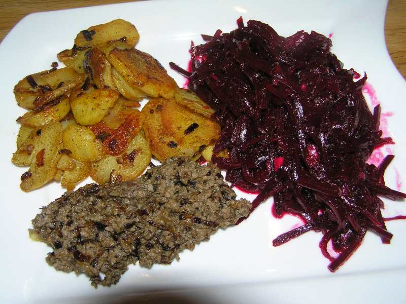hier gabs bratkartoffeln und mit zwiebeln gebratene grober leberwurst, dazu rote bete salat.