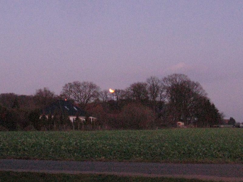 Wenn es nur um ein Beweisfoto geht? .... Bitteschön! ;DSüdlich von Bremen ca. 16.45 Uhr, als der Mond schon zur Hälfte aus dem Schatten wieder heraus war. Leider ist es nur ein Schnappschuss.