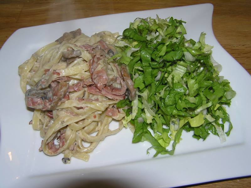 bei uns gabs dünne bandnudeln mit einer soße aus champignons, rohem schinken, zwiebel, knoblauch, weißwein und frischkäse.dazu wieder endiviensalat.