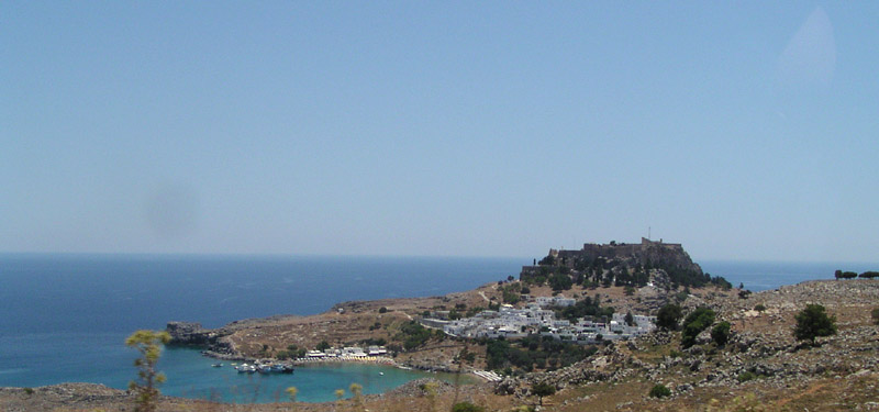 Und das ist Lindos. Über der Stadt sieht man die Kreuzritterfestung, in deren Inneren sich noch alte Reste einer Akropolis befinden. In der Bucht ist der Legende nach einmal Petrus gestrandet.