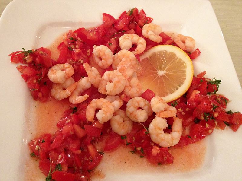 biogarnelen auf tomatensalat mit saft von meyers zitrone, kresse und pistazienöl, meersalz und weißem pfeffer gewürzt