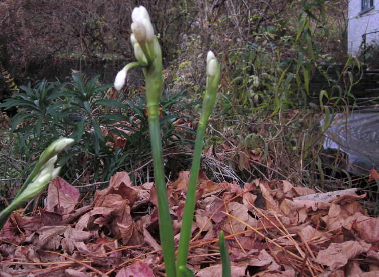 Ich bekam vor einigen Wochen Tazettenknollen geschenkt. Nach langem Zögern -ihr Duft ist mir zu stark- warf ich sie auf den Kompost. Dies das Ergebnis, bis Weihnachten werden sie wohl kaum durchhalten.