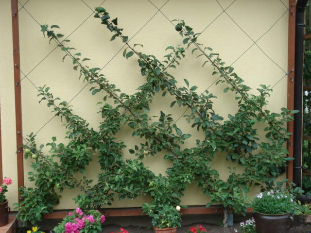 hi zwiebelchen,du hast sie sicherlich auf meiner hp gesehen, vermute ich mal. ein paar erläuterungen dazu:wie bei nahezu allen spalierbäumchen sollten es solche sein, die auf schwach wachsender unterlage sehr tief unten veredelt sind. und genau da beginnt das eigentliche problem. wenn du dir die bäume nicht selber veredelst (ich auch nicht), dann bleibt dir nur übrig, dir eine baumschule zu suchen, die dir entweder genau diese veredlungen durchführt oder die eh schon niedrig veredelt hat. am besten geeignet sind einjährige veredelungen, zweijährige gehen auch. etwa 10-15 cm über der veredlungsstelle, aber nicht höher als 20-25 cm über dem boden, schneidest du dann die stämmchen einfach ab, wenn sie an die vorgesehenen stellen eingepflanzt sind. die schlafenden augen kommen im frühling zum austrieb und du kannst sie nach deinen wünschen formen, solange das holz weich ist. der begriff belgische obsthecke stellt die wuchsform dieser bäume dar, schräg über kreuz. ich selber mag es, da die gekreuzte form sichtbar zu halten, also auch die "löcher" zu erhalten. normalerweise begrenzt man sie in der höhe bei 150 - 300 cm. ich habe hier dazu am haus ein gerüst aus balken und spanndraht errichtet, wobei die pflanzabstände bei 70 cm liegen und ich so auf auf der spitze stehende quadrate von 50 x 50 cm komme. die nach rechts wachsenden triebe führe ich vor dem spanndraht entlang, die nach links führenden dahinter.die befestigung der triebe erledige ich mit klammern, solange die triebe klein sind. wenn die triebe dann stärker werden, verwende ich bänder.kdb