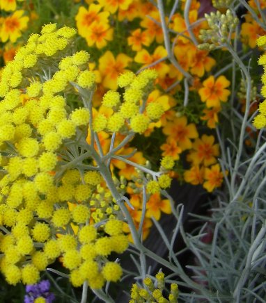 Hallo Topfgarten!Vorigen Herbst habe ich mir eine hübsche silbergraue Pflanze gekauft, die mit ziemlicher Sicherheit ein Helichrysum ist. Ich habe es zu einer Clematis viticella in einen Topf mit 50 Zentimeter Durchmesser gepflanzt (nicht weil das optisch so toll wäre oder sie besonders gute Nachbarn wären, sondern schlicht und einfach, weil in diesem Topf noch ein biserl Platz war). Der Topf stand den ganzen Winter draußen (wir sind zwar auch Weinbaugebiet, aber es gab trotzdem Kahlfrost mit -17°C), als Winterschutz gab es nur ein bischen Holz (Roll-Palisade um den Topf gewickelt) und Tannenreisig obendrüber. Heuer ist dieser Currystrauch so rasant gewachsen, daß mir mittlerweile ein bischen Bange um die benachbarte Clematis wird! Die gelbe, wunderbar süßlich duftende Blüte ist gerade zu Ende gegangen. Ins Freie ausgepflanzt müßte der Currystrauch eigentlich noch viel besser durch den Winter kommen. Vielleicht kannst du ja unter die Pflanze ein bischen Dränagematerial (Kies, groben Sand) geben und im Winter mit Koniferenzweigen abdecken?Liebe Grüße, Barbara
