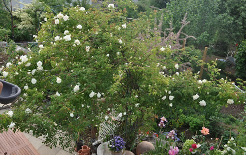 Ein Blick auf die gegen 6m breite und gerade aufblühende Park's Yellow Tea-Scentet China vom Mai letzten Jahres, einer meiner grössten Lieblingsrosen.