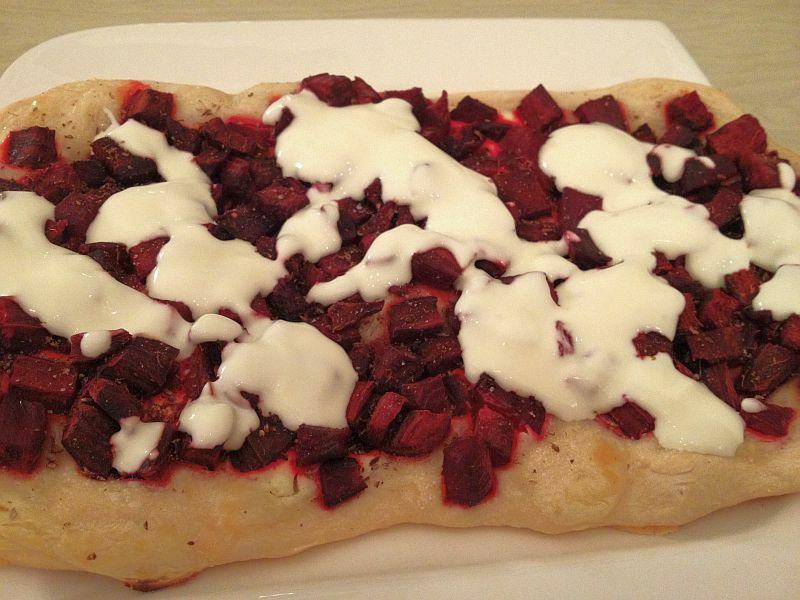 Hast du da nur Rote Bete und Käse drauf getan oder noch mehr?hier gab es eine rote-bete-pizza mit saurer sahne. etwas schlicht, aber lecker!