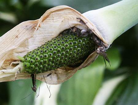 Und obwohl ich nichts riechen konnte, waren viele Insekten an der Blüte. Die Basis der Spatha war fast 1 cm hoch mit toten Insekten bedeckt - hab ich auch noch nicht erlebt