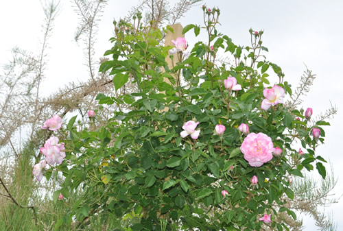 Ein Blick auf die gegen 6m breite und gerade aufblühende Park's Yellow Tea-Scentet China vom Mai letzten Jahres, einer meiner grössten Lieblingsrosen.