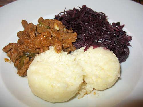 ... und dann Rotkohl mit Geschnetzeltem vom Rind, dazu einen rohen Kloß.