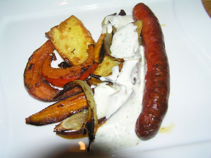 gerade gabs bei uns ofengemüse (kürbis, kartoffel, zwiebel, karotte) mit bärlauchjoghurt und dazu ein scharfes paprikawürstchen, dass auf dem gemüse mitschmurgeln durfte