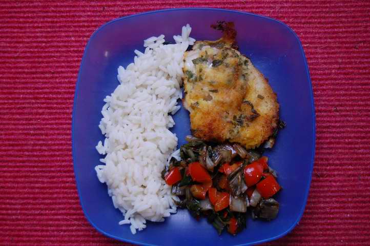 Heute gab es Reis, Paprika-Mangold-Würfel und mit Salbei panierten Seelachs.