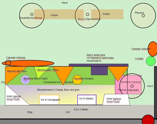 Nun quäle ich mich schon monatelang mit der Planung für ein Beet von 6,5 x 2 m.Dieses liegt zwischen dem allgemeinen Gartenbereich und dem Obstgarten. Davor führt der Weg vom Tor zum Gartenhaus vorbeiEs wachsen dort zwei Campsis und am Nordende des Beetes ein frisch gepflanzter Aprikosenbaum. Ich möchte Orangegelbes mit ein bisschen Blaulilanem kombinieren. Der Boden ist sandig, an dieser Stelle etwas aufgekalkt und mit Katzenstreu versehen. Ich erhoffe mir davon, dass Euphorbien und evtl. Helenium und Achillea besser gedeihen als an anderer Stelle. Damit ist das Beet aber nix mehr für magersüchtige. Bei mir ist es oft bis zu 6 Wochen am Stück trocken aber es gibt auch sehr nasse Perioden. mir sind schon mehr Pflanzen abgesoffen als verdurstet, aber manche mögen die schlechte/unregelmäßige Versorgung mit Wasser und Dünger halt nicht.Zu der Campsis soll Apios americana ziehen, die ist zwar nicht wirklich lilablau aber das lasse ich ihr durchgehen. Sie kommt in einen Maurerkübel und da sie spät austreibt bekommt sie Artemisia ludiviciana zur Gesellschaft darin. Zwei Buddleia, Black Knight und Sungold - wahrscheinlich zunächst als Stecklinge, dürfen probieren ob sie die Winter aushalten und gleichzeitig das Element Höhe vertreten. Ich denke mir das Beet in 4 Bändern von 0,5 m Breite. Das heißt aber nicht dass Ausreißer und Zacken oder Wellen in der Grundform nicht möglich wären.1. ein langes Band aus H. fulva und H. citrina. 2. ein Band in dem hohe Gräser und Euphorbien dominieren. Hier stehen auch die Buddleien3. ein Band in dem mittelhohe gelbe und blaue Stauden spielenhier liegen mir Rudbeckia und Asclepias am Herzen, Asphodeline muss umziehen und die Heleniums 4. ein Band in dem Aster pansus die Ecken umspielt und auch Iris zusammen mit niedrigen Gräsern spielen können.So jetzt versuche ich noch den Plan und die vorläufige Pflanzenliste einzustellen. Ingeborg und dann verteile ich Sonnenbrillen – nee keine Angst die Planversion in der alles gleichzeitig blüht lasse ich weg.