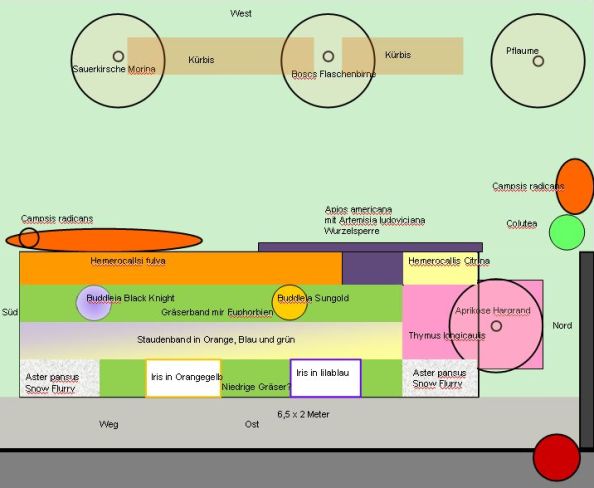 Nun quäle ich mich schon monatelang mit der Planung für ein Beet von 6,5 x 2 m.Dieses liegt zwischen dem allgemeinen Gartenbereich und dem Obstgarten. Davor führt der Weg vom Tor zum Gartenhaus vorbeiEs wachsen dort zwei Campsis und am Nordende des Beetes ein frisch gepflanzter Aprikosenbaum. Ich möchte Orangegelbes mit ein bisschen Blaulilanem kombinieren. Der Boden ist sandig, an dieser Stelle etwas aufgekalkt und mit Katzenstreu versehen. Ich erhoffe mir davon, dass Euphorbien und evtl. Helenium und Achillea besser gedeihen als an anderer Stelle. Damit ist das Beet aber nix mehr für magersüchtige. Bei mir ist es oft bis zu 6 Wochen am Stück trocken aber es gibt auch sehr nasse Perioden. mir sind schon mehr Pflanzen abgesoffen als verdurstet, aber manche mögen die schlechte/unregelmäßige Versorgung mit Wasser und Dünger halt nicht.Zu der Campsis soll Apios americana ziehen, die ist zwar nicht wirklich lilablau aber das lasse ich ihr durchgehen. Sie kommt in einen Maurerkübel und da sie spät austreibt bekommt sie Artemisia ludiviciana zur Gesellschaft darin. Zwei Buddleia, Black Knight und Sungold - wahrscheinlich zunächst als Stecklinge, dürfen probieren ob sie die Winter aushalten und gleichzeitig das Element Höhe vertreten. Ich denke mir das Beet in 4 Bändern von 0,5 m Breite. Das heißt aber nicht dass Ausreißer und Zacken oder Wellen in der Grundform nicht möglich wären.1. ein langes Band aus H. fulva und H. citrina. 2. ein Band in dem hohe Gräser und Euphorbien dominieren. Hier stehen auch die Buddleien3. ein Band in dem mittelhohe gelbe und blaue Stauden spielenhier liegen mir Rudbeckia und Asclepias am Herzen, Asphodeline muss umziehen und die Heleniums 4. ein Band in dem Aster pansus die Ecken umspielt und auch Iris zusammen mit niedrigen Gräsern spielen können.So jetzt versuche ich noch den Plan und die vorläufige Pflanzenliste einzustellen. Ingeborg und dann verteile ich Sonnenbrillen – nee keine Angst die Planversion in der alles gleichzeitig blüht lasse ich weg.