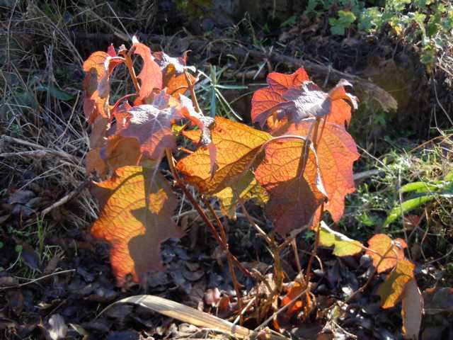 Im deutschen Januar sind noch nicht mal alle Blätter gefallen, hier Hydrangea quercifolia. Ist auch noch ein bunter Klecks in meinem Garten, auch wenns keine Blüte ist