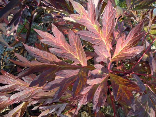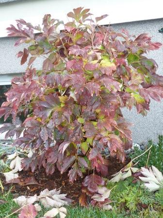 Nach meiner Erfahrung färben die Strauchpfingstrosen am Besten an trockeneren Standorten. Wo sie bei mir relativ "fett" stehen, bleiben die Blätter bis zum Frost grün und fallen dann braunverunzelt ab.