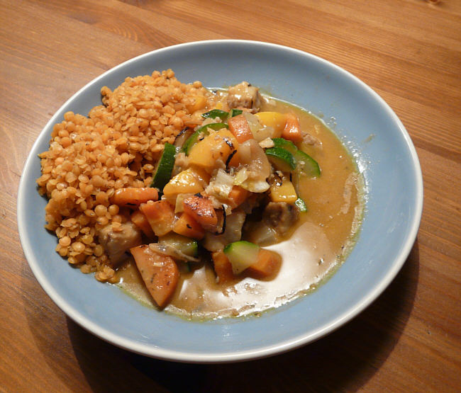 Naja - die Optik meines Essens ist jetzt nicht soooo toll, aber geschmeckt hat es! Fischcurry (seelachs) mit roten Linsen, diversen Gemüsen und Pfirsich (Mango war aus).