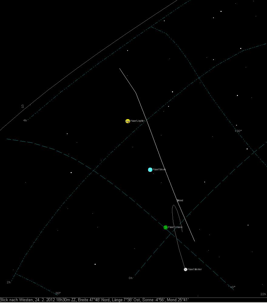 Heute Abend steht (oder stand) der zunehmende Mond als schmale Sichel nach Sonnenuntergang ganz tief am südwestlichen Abendhimmel.Morgen Abend hat er sich schon ein Stück höher empor gearbeitet. Es lohnt sich, bei klarem Südwesthimmel in den nächsten Tagen mal einen Blick dorthin zu werfen.Anbei eine Grafik des Abendhimmels, ca. 30 min nach Sonnenuntergang, auf der die Mondbahn für die nächsten Tage eingezeichnet ist. Der Mond zieht nicht weit entfernt von den beiden Planeten Venus und Jupiter vorbei, die beiden hellsten Planeten.Unterhalb der Venus gewinnt Merkur etwas Abstand von der Sonne und kann ab nächster Woche ca. eine Stunde lang ausgemacht werden. Ist nicht ganz einfach, aber wenn man ihn einmal entdeckt, gibt es keinen Zweifel: Typisch für eineh Planeten flackert sein Licht kaum, und er leuchtet in einem typischen Chromgelb.Das ist die einzige gute Chance das ganze Jahr lang, Merkur am Abendhimmel zu sehen. Ach so: Das grünliche Scheibchen im Bild ist der Uranus. Den sieht man definitiv nicht!