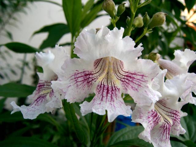 Habe leider keine Erfahrung mit Bäume schützen. In diesem Winter will ich selber wegen meines Eucalyptus auf der Hut sein. Werde aber dann wenn eher nur einen Windschutzschirm gegen Ostwinde aufstellen.Steht er denn völlig exponiert oder doch etwas windgeschützter?Wurzelbereich mit Tannenreisig abdecken, kann ich empfehlen. Das hatte ich bei der Leycesteria, die sich ja auch nach Frost regeneriert, immer gemacht. Auf jeden Fall: herzlichen Glückwunsch zu dieser Rarität mit den wunderschönen Blüten.Sehr interessant, was man dazu so liest! Wüsten-Catalpa - Nektar für Kolibris. - Strauchartig wachsend...Die Frostresistenz wird auf -20 °C angegeben. Weitere Eigenschaften von x Chitalpa sind eine gute Trockenheitsresistenz, Unempfindlichkeit gegen Wind und eine gute Regeneration nach Frostschädigung
