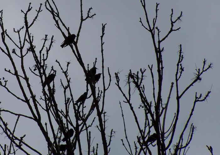 Heute früh hat der Star sehr lange gesungen. Er hat schrille Raubvogel-Rufe (Falke?) in seinem Gesang. Ob die Starenmädels darauf abfahren oder eher abgeschreckt werden? Später hat er die Höhle ausgeräumt. Es hat richtig gestaubt.Vormittags kreiste ein Habicht, verfolgt von erst einer einzelnen Krähe, dann von mehreren. Als ein 2. Habicht dazu kam, sind sie abgedreht. Leider sind meine Fotos nichts geworden.